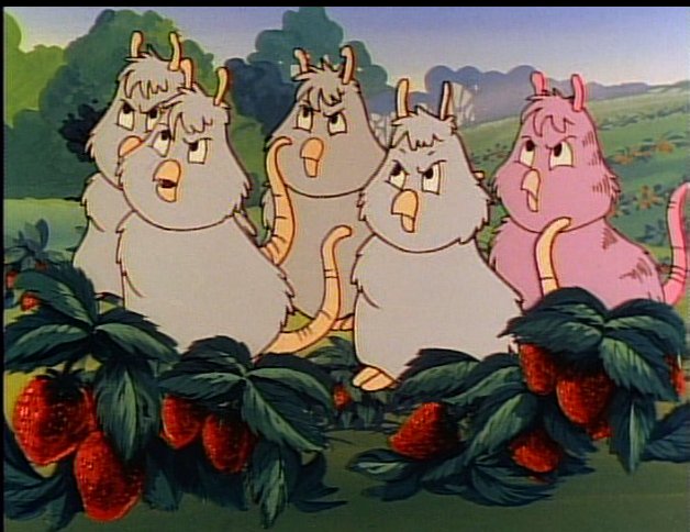 the chaos, Gimmick loses his glasses in the yard. While the trio are