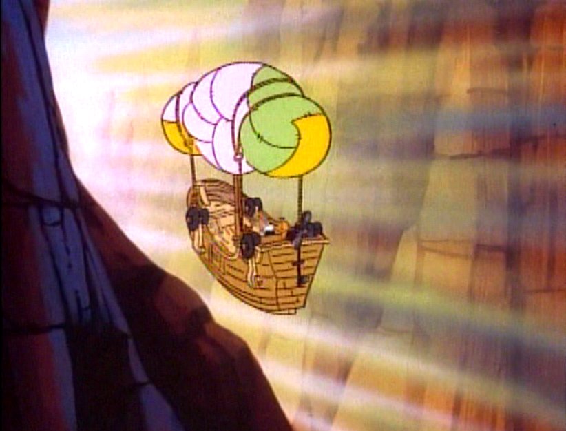a plan. The miniature trio climb in the newly shrunken Airship and fly