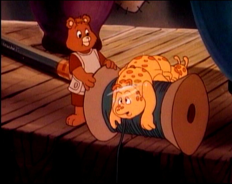 While Teddy and Grubby attempt to tape the string to the table so